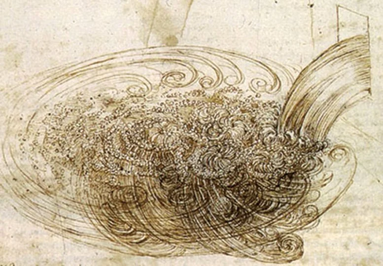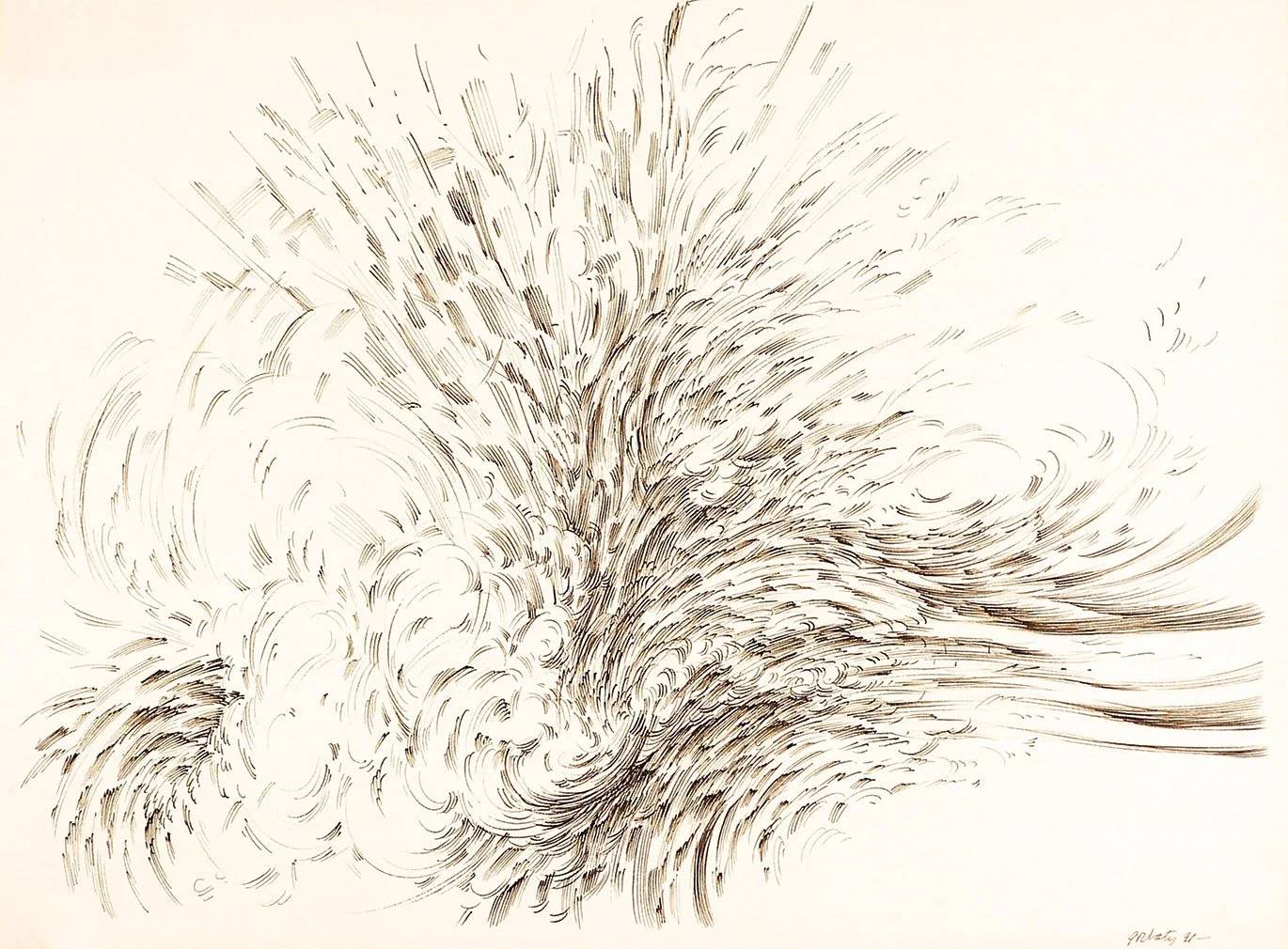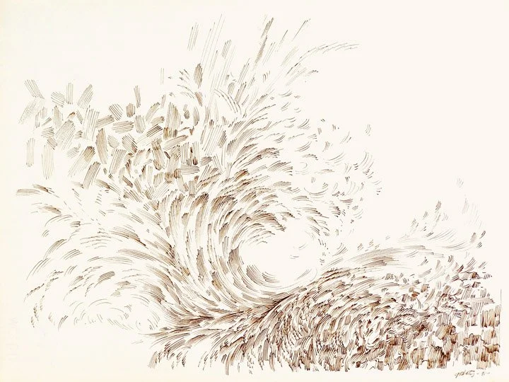 Perhaps the dynamics are most evident in Gorbaty’s stunning images of waves, pen and brown ink drawings in which he depicts, with amazing verisimilitude, their sweeping movement. He seems to capture them at the moment they crest and break, when they’re an intricate conflation of centripetal and centrifugal forces, in Wave No. 11 more the former, in Wave No. 22 more the latter. Gorbaty’s waves have the same contradictory dynamics as Leonardo’s whirlpools:3 his drawings are more than a match for Leonardo’s, both in their excruciating sense of detail and power of concentration. Gorbaty’s drawings are as cosmically scaled yet as intimate as Leonardo’s. His rapidly flowing water is charged with the same sense of ecstatic turbulence and hypnotic sublimity.