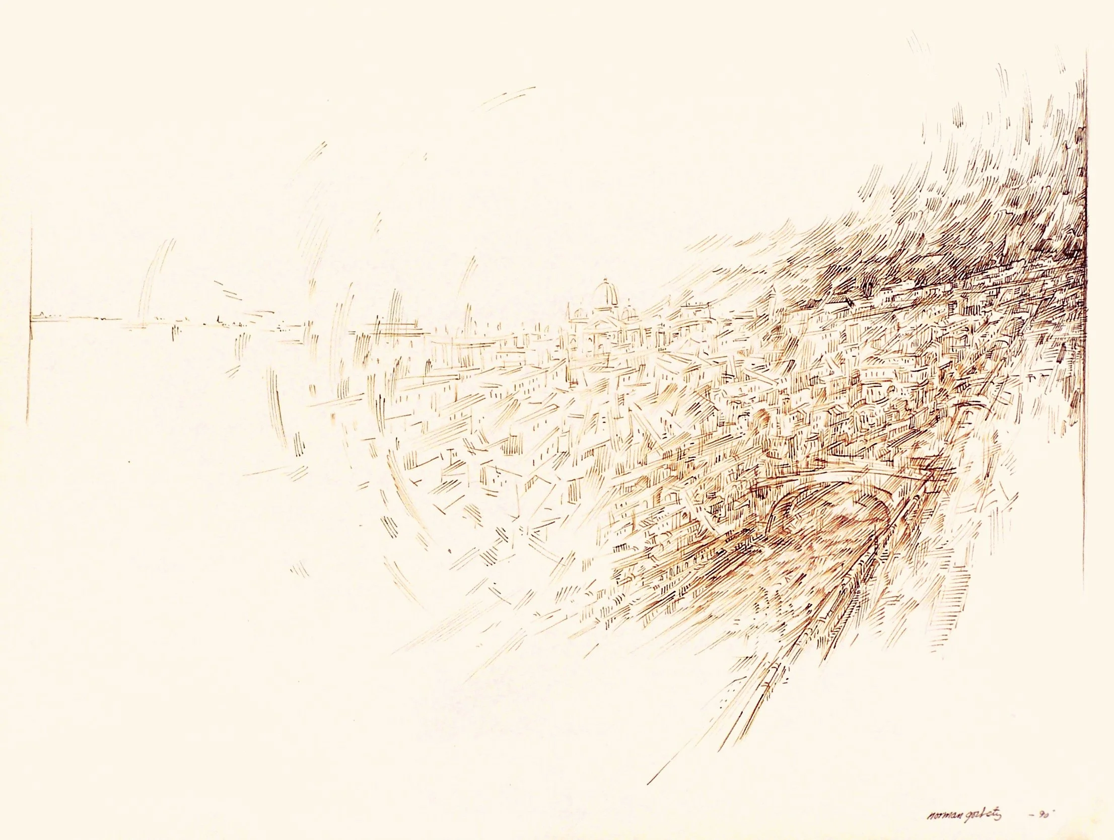 There may be an apocalyptic wind blowing in Olive Trees4 and Stranger,5 but the telltale signs of their aesthetic purity are the large areas of untouched paper, paradoxically transformed into experienced space because no line has darkened their whiteness, bringing it down to earth. If they were filled in with detail—even the finest detail of which Gorbaty is capable—the drawings would be less esthetically consummate. Transformed by being untouched, the vacuums of space give Gorbaty’s drawings ethereal freshness, beauty, and profundity, making them masterpieces rather than mere records. They acquire an abstract aura epitomizing the dynamic core of nature. The fluidity of Gorbaty’s handling adds to the wind’s fluidity, convincing us that we feel it in all its immediacy, as he does. Trees Up, Florence, Paris,6 Rome,7 and Landscape Venice make particularly daring use of the pellucid whiteness of the paper. It conveys the enormous space encapsulated in the picture, as well as the light flooding the space, so that it seems the space of the sky. So blinding is the light in the emptiness that the trees and buildings reduce to incidental shadows, sketchily nuancing it with their “touchiness.”